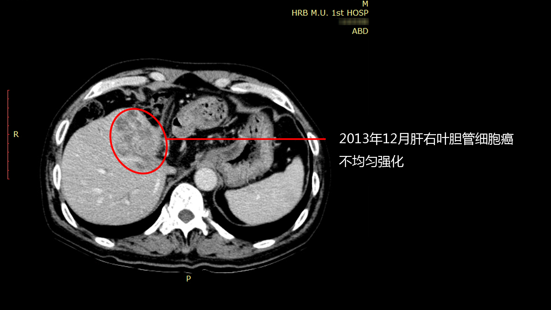 2013年12月CT显示:肝右叶胆管细胞癌不均与强化。